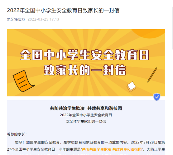 安全無小事,抓好安全工作是維護學校正常秩序、提高教育質量的基礎。學校法制安全科、學生科及時組織各專業(yè)部轉發(fā)由“河北教育發(fā)布”和“象牙塔”微信公眾號聯(lián)合發(fā)布的“致家長的一封信”,真正做到家校共育,雙管齊下,家校有機有效互聯(lián)互通,共同保護學生健康快樂成長。