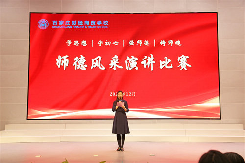 為進(jìn)一步深化師德師風(fēng)建設(shè),積極引導(dǎo)教師樹立教書育人、為人師表的良好形象,充分展示教師的高尚師德和責(zé)任擔(dān)當(dāng),12月18日,石家莊財經(jīng)商貿(mào)學(xué)校2023年校園文化節(jié)——師德風(fēng)采演講比賽決賽在財貿(mào)禮堂舉行。