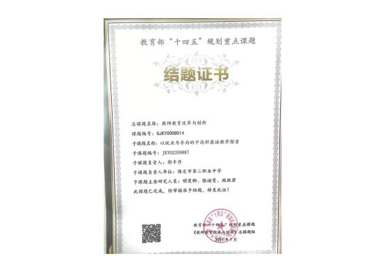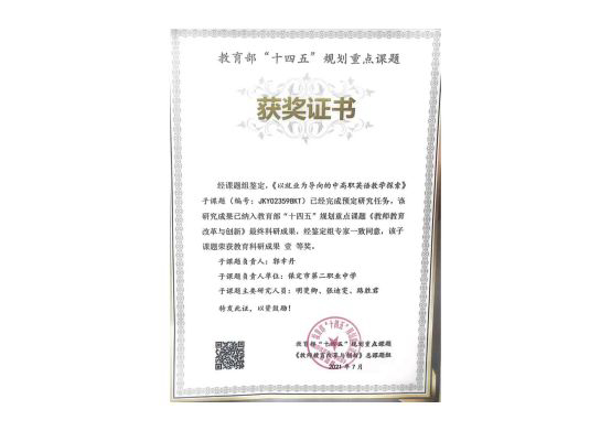 課題《以就業(yè)為導(dǎo)向的中高職英語教學(xué)探索》結(jié)題證書、獲獎證書