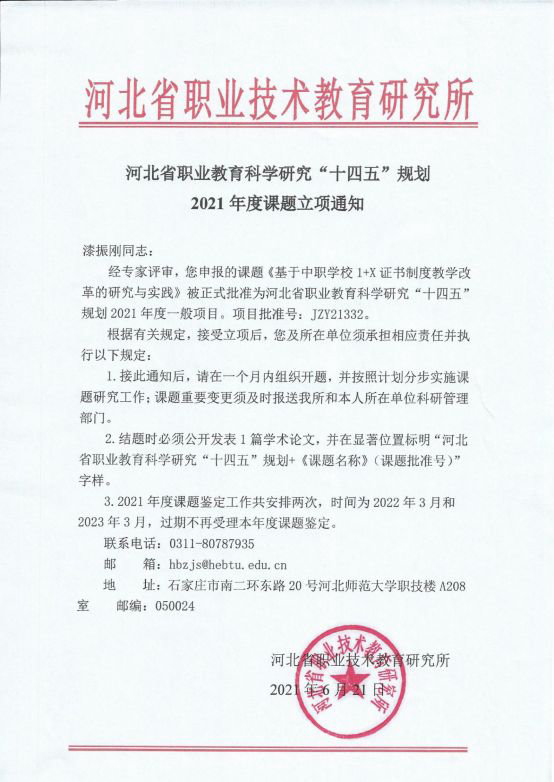 課題《基于中職學校1+X證書制度教學改革 的研究與實踐》立項通知