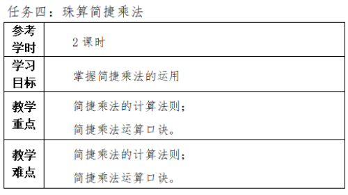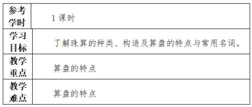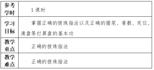 (2)掌握珠算加減法的基礎(chǔ)知識和算法,了解珠算乘除法的基礎(chǔ)知識和運算基本步驟。