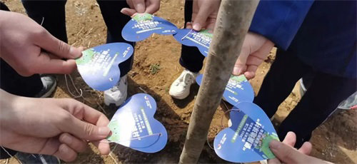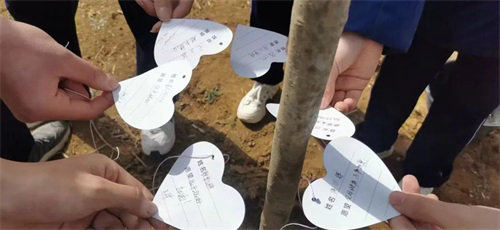 “抬鐵鍬,為春天打造溫暖的臥床;提水桶,為春天獻上甜美的甘露;寫愿卡,為春天記下‘美好的名牌’。抬眼望去,綠意四起、一片生機。有向下扎根的力量,有向上生長的勇氣。十年如何?百年又如何?終有一日,必將獨傲青天。