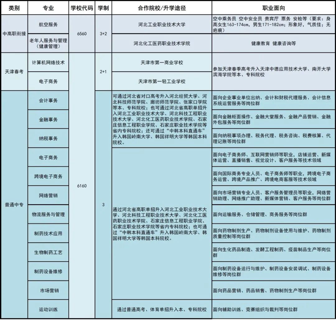 學(xué)校專業(yè)建設(shè)和發(fā)展定位,以中等職業(yè)教育“財經(jīng)商貿(mào)”大類和“食品藥品與糧食”大類為主,兼顧社會緊缺專業(yè)的其他大類。形成了以“會計事務(wù)”“電子商務(wù)”“制藥技術(shù)應(yīng)用”“市場營銷”“物流服務(wù)與管理”5個省級骨干特色專業(yè)為龍頭的“財經(jīng)”“商貿(mào)”“制藥”“物流”四大專業(yè)群。目前開設(shè)會計事務(wù)、金融事務(wù)、納稅事務(wù)、電子商務(wù)、跨境電子商務(wù)、網(wǎng)絡(luò)營銷、物流服務(wù)與管理、制藥技術(shù)應(yīng)用、生物制藥工藝、制藥設(shè)備維修、市場營銷、計算機網(wǎng)絡(luò)技術(shù)、運動訓(xùn)練等13個普通中專專業(yè),以及航空服務(wù)、老年人服務(wù)與管理(健康管理)2個“3+2”中高職銜接專業(yè)。