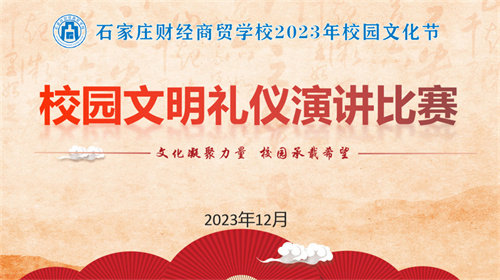 為了進(jìn)一步樹立學(xué)生的文明意識,提高學(xué)生的文明禮儀素養(yǎng),豐富校園文化生活,12月20日,石家莊財經(jīng)商貿(mào)學(xué)校2023年校園文化節(jié)——校園文明禮儀演講比賽成功舉行。