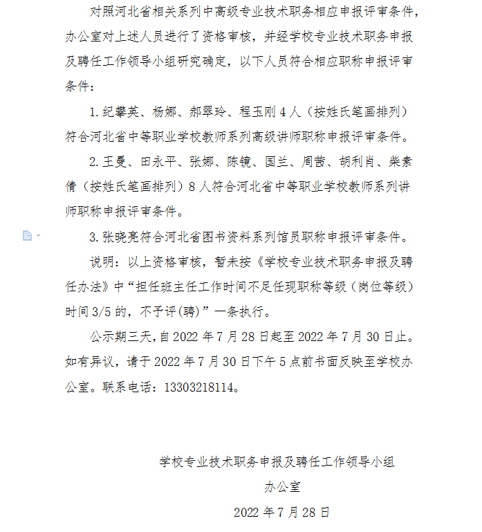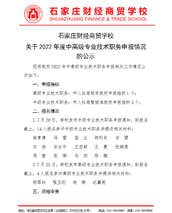 石家莊財(cái)經(jīng)商貿(mào)學(xué)校關(guān)于2022年度中高級(jí)專業(yè)技術(shù)職務(wù)申報(bào)情況的公示