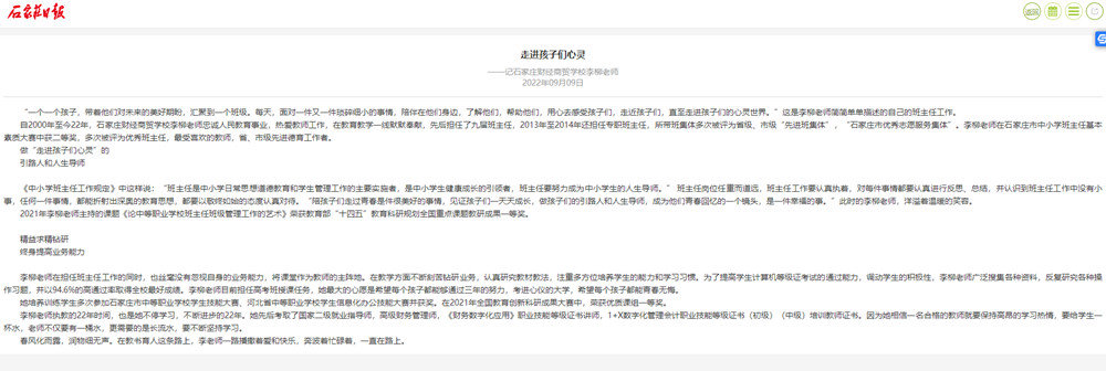 自2000年至今22年,石家莊財(cái)經(jīng)商貿(mào)學(xué)校李柳老師忠誠人民教育事業(yè),熱愛教師工作,在教育教學(xué)一線默默奉獻(xiàn),先后擔(dān)任了九屆班主任,2013年至2014年還擔(dān)任專職班主任,所帶班集體多次被評(píng)為省級(jí)、市級(jí)“先進(jìn)班集體”,“石家莊市優(yōu)秀志愿服務(wù)集體”。李柳老師在石家莊市中小學(xué)班主任基本素質(zhì)大賽中獲二等獎(jiǎng),多次被評(píng)為優(yōu)秀班主任,最受喜歡的教師,省、市級(jí)先進(jìn)德育工作者。