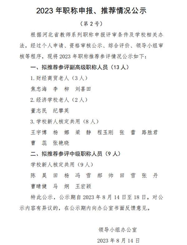 2023年職稱申報、推薦情況公示(第2號)