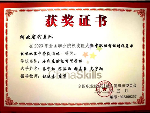 在2023年全國職業(yè)院校技能大賽(中職組)智能財稅基本技能比賽中,我校代表隊榮獲團體一等獎,實現(xiàn)了歷史性突破,趙建素、龐翠兩位老師榮獲優(yōu)秀指導(dǎo)教師。在比賽中,4名參賽選手頑強拼搏、奮勇爭先,展現(xiàn)了精湛的技能水平和良好的精神風(fēng)貌。此次成績的取得充分展示了我校專業(yè)教學(xué)實力和實踐技能水平,也進一步提升了學(xué)校影響力,不僅為學(xué)校,也為石家莊市乃至為河北省爭得了榮譽!