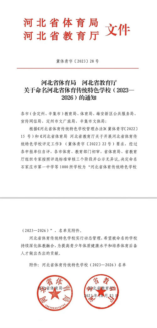 學(xué)校被河北省體育局、河北省教育廳命名為河北省體育傳統(tǒng)特色學(xué)校,學(xué)校體教融合進一步深化。