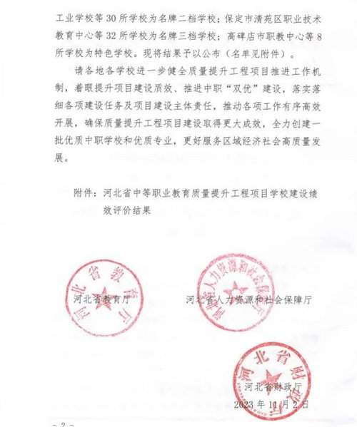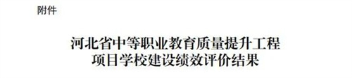 根據(jù)2023 年度河北省中等職業(yè)教育質(zhì)量提升工程項目學(xué)校建設(shè)績效評價結(jié)果,我校被確定為名牌學(xué)校第一檔,實現(xiàn)重大跨越。