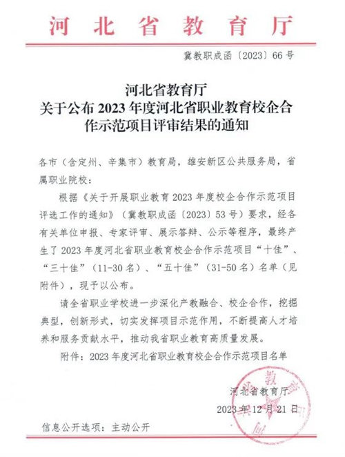 學(xué)校財經(jīng)專業(yè)群校企合作建設(shè)案例被評為河北省職業(yè)教育2023年度校企合作示范項目“三十佳”。