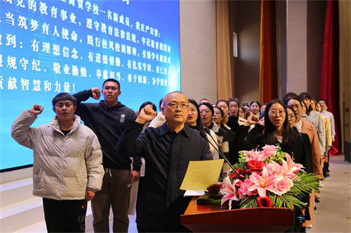 大會(huì)伊始,40名青年教師進(jìn)行了莊嚴(yán)的入職宣誓,辦公室董志民主任領(lǐng)誓。錚錚誓言,展現(xiàn)了青年教師們不忘初心、不辱使命、立志從教的決心和意志。