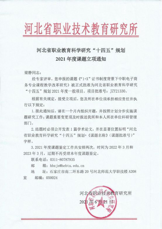 課題《1+X證書制度背景下中職電子商 務(wù)專業(yè)課程教學改革研究》立項通知