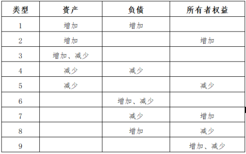 經(jīng)濟業(yè)務(wù)對會計基本等式的影響,可擴展為九種類型,見下表。